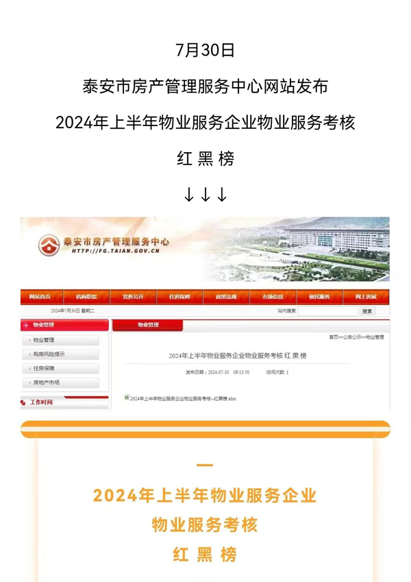 7月30日,泰安市房產(chǎn)管理服務(wù)中心發(fā)布泰安市2024年上半年物業(yè)服務(wù)企業(yè)物業(yè)服務(wù)考核紅黑榜,新泰市華通物業(yè)管理有限公司榮登紅榜,物業(yè)服務(wù)榮獲優(yōu)秀等級(jí)。