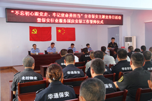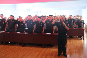 最后,在場全體保安人員面對(duì)黨旗、國旗就70周年國慶安保工作進(jìn)行宣誓。堅(jiān)決服從命令、聽黨指揮、勇敢擔(dān)當(dāng)、不負(fù)重托、文明執(zhí)勤、嚴(yán)守紀(jì)律、不辱使命、恪盡職守,迎接一切挑戰(zhàn),戰(zhàn)勝一切困難,全力以赴,決戰(zhàn)決勝,堅(jiān)決打贏安保維穩(wěn)攻堅(jiān)戰(zhàn),全力投身建國七十周年安保任務(wù),為70周年建國大慶獻(xiàn)禮。(張遷)