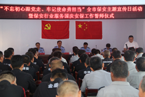 本次活動(dòng)共有三項(xiàng)議程,一是三家保安服務(wù)公司代表上臺(tái)表態(tài)發(fā)言,二是市公安局楊德軍書記講話,第三項(xiàng)在場全體保安人員做安保工作誓師。